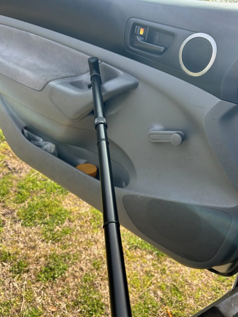 I use another reaching tool with my Tacoma. To close the driver’s side door, after I get behind the wheel, I must use my cane to close the door, hooking the handle end on the interior door handle, and pull with both hands. I don’t have the reach or strength with my left arm to successfully close that door, and have to use this adaptive hack, at least for now.