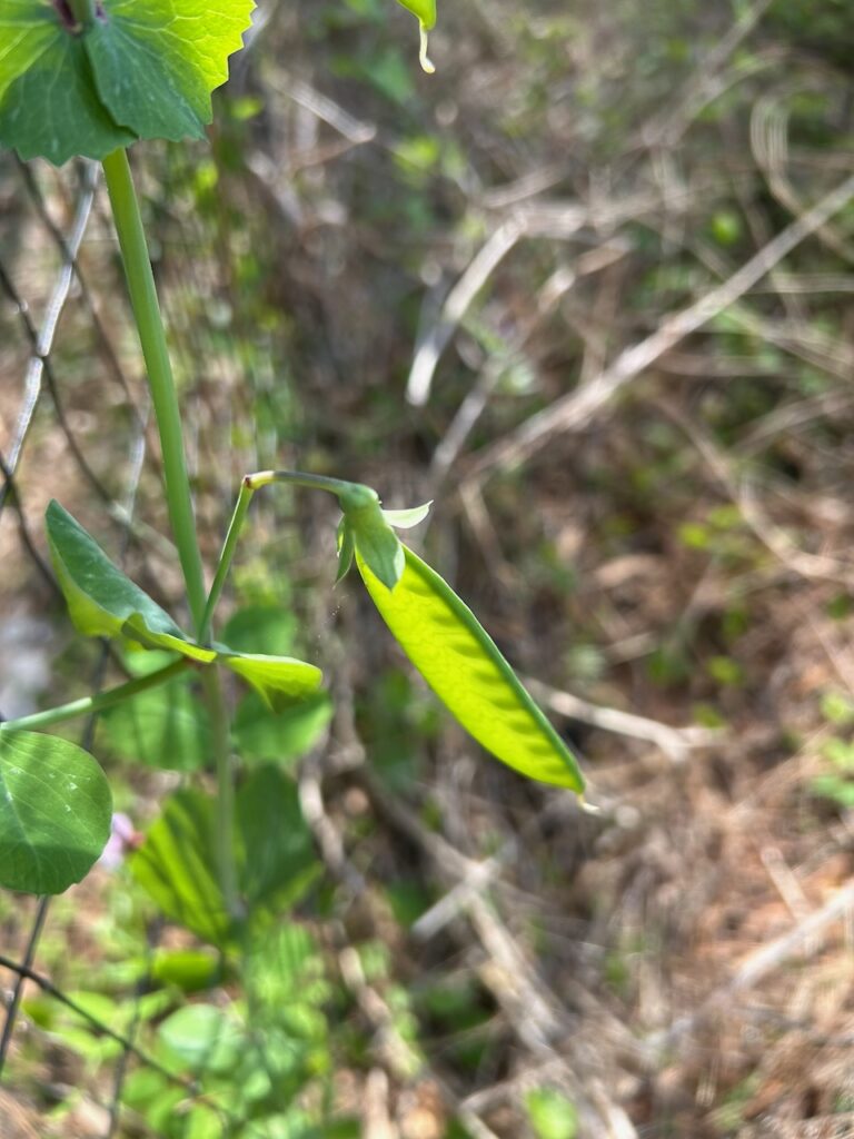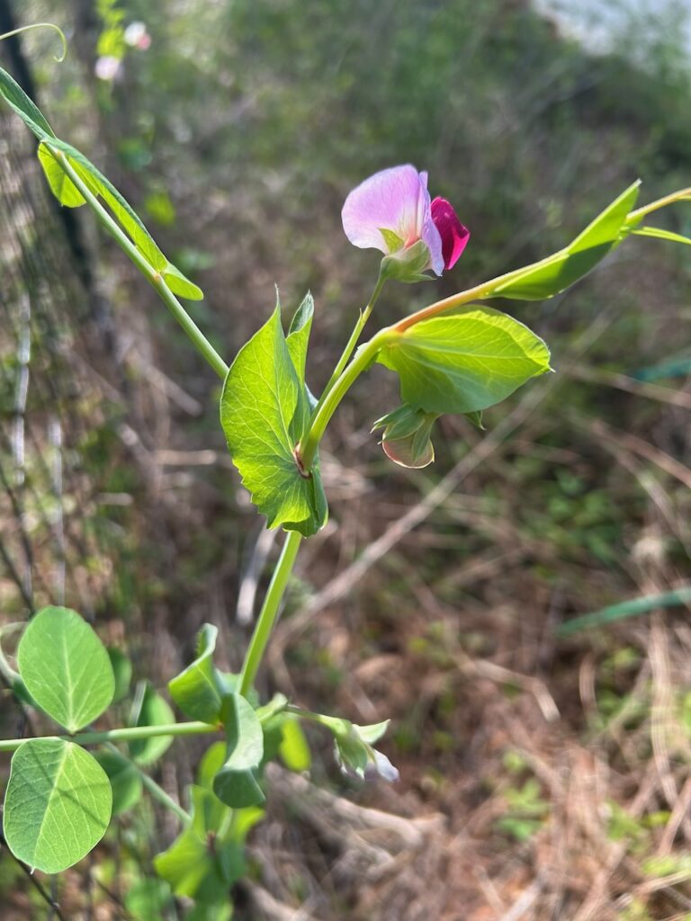 Of the cultivated vines, the lady banks rose growing up a trellis built during a shed rebuild several years ago has leaped over to reach further skyward on a crepe myrtle. And over in the vegetable area of the garden several sugar snap pea vines climb up a fence installed for vertical growing. This fence was full of pea vines last winter, but comparing this year to last is not helpful. I didn’t get to notice the blooms on the vines last year – they are beautiful, and signal the pea pods to follow. They can be eaten right off the vine.