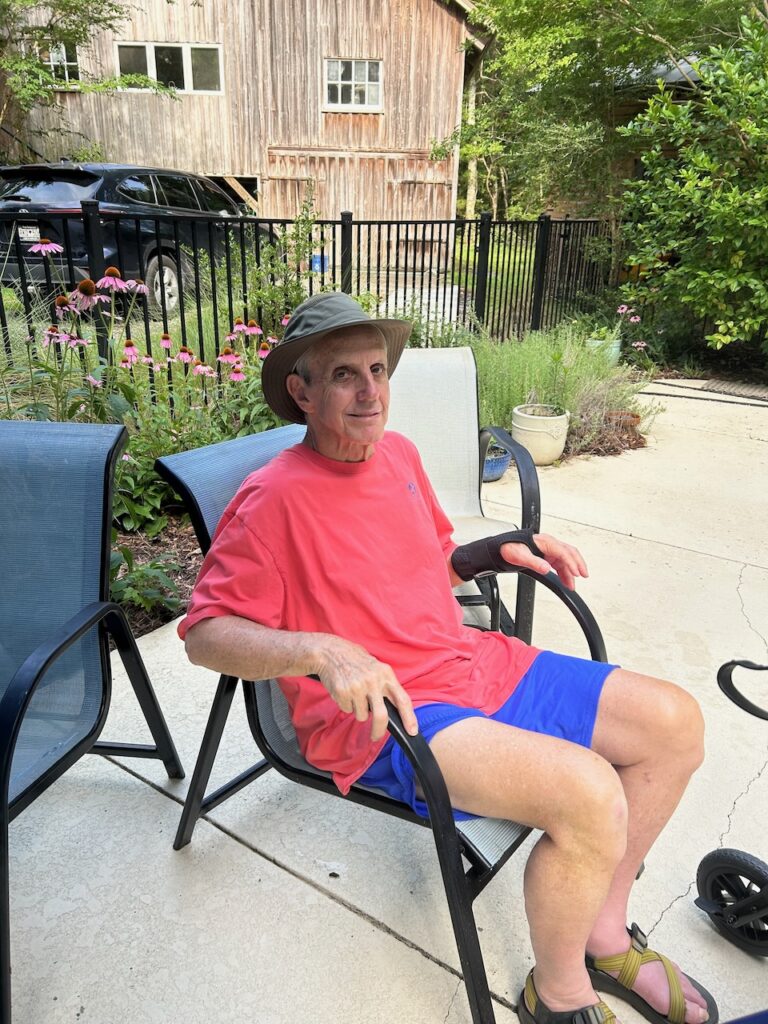 My main deficit was left-sided weakness: my left arm and leg were not working at all – were flaccid. PT taught me how to get around in a wheelchair using just my right arm and right leg (used for steering). The initial results were poor – I was like a drunken sailor in the hallway, veering from one wall to another. I came to accept my deficits, and learn about strokes. I was fortunate to have no speech or cognitive deficit, though I was confused initially. I was grateful to have excellent care from the nursing staff, and skilled help from the therapists, as well as daily visits from my wife Susan.