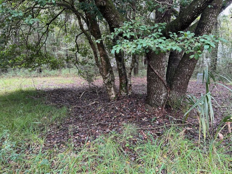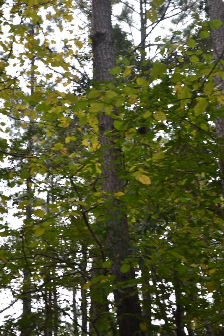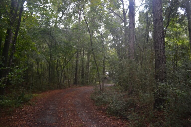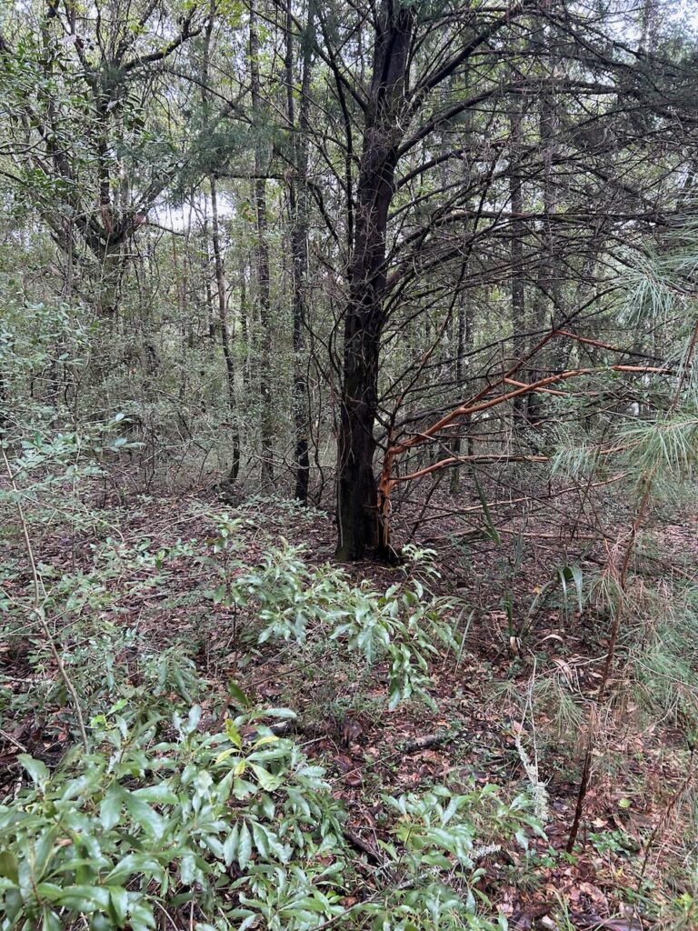 I started off on the well worn path, one I have walked many times. It curves through a mature forest of oaks: live, laurel, and water; loblolly pines, mockernut hickory, southern magnolia, sweet gum, black gum (sour gum or black tupelo),and red mulberry. Sprinkled in these woods are dogwood, American holly, black cherry, and red maple. In late October some of the leaves have begun to fall and change color, particularly the large leaves of the mulberries, littering the walkway. As the path continues toward the southeast, a slight elevation change occurs, and this subtle descent is marked by dwarf palmettos along the path in the understory mostly dominated by yaupon holly. Indigenous peoples in the southeast made a tea with the yaupon leaves – “black drink” for spiritual purposes, this shrub which can grow to small tree size. The turn around for this hike is our mail box, since this walkway is the driveway on our property. We purchased this 3.5 acres of land in 1980 as the site where I would build our house. To start, I laid out the drive and house site, and cut down the trees and shrubs.