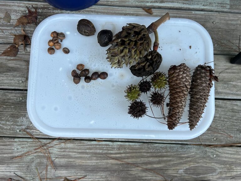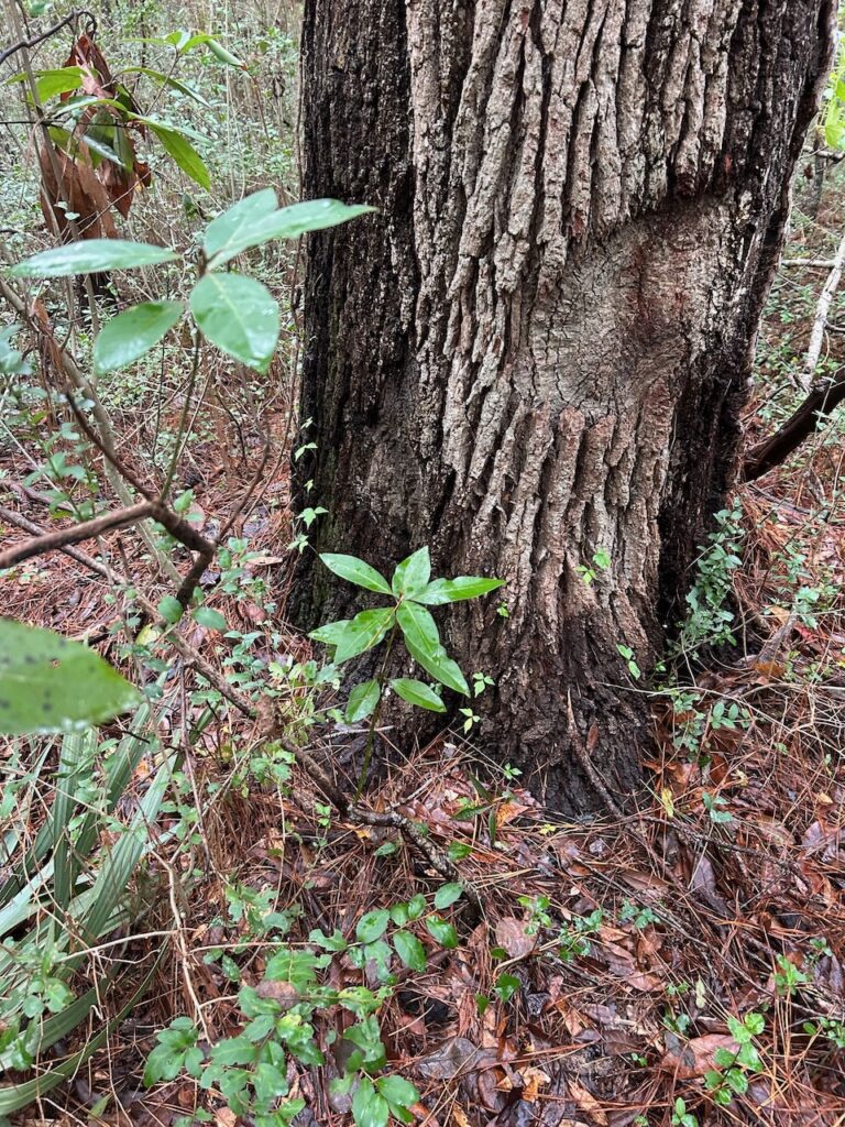 Speaking of seedlings, the trees of the forest have a diversity of seed dispersal devices, and the following photo captures an assembly of these seed carriers (live oak acorns, laurel oak acorns, hickory nuts, magnolia seed pods, sweet gum balls, loblolly pine cones). I recently read Douglas Tallamy’s The Nature of Oaks, and he makes the case for oaks being the most important trees for supporting wildlife.