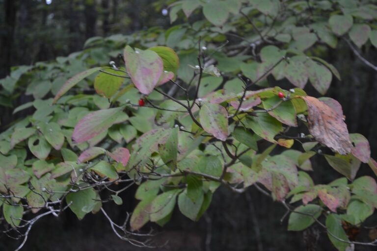 One of the beauties of our property that we discovered after the purchase was the understory filled with flowering dogwoods. Both in spring when the flowering was at a peak, and fall when the leaves changed to their fine hues, were times when our woods became a stunning wonderland. After Hurricane Hugo devastated the forests of Awendaw, many of our mature trees came down (the oaks uprooted, the pines sheared off), and we felt relieved our dogwoods stood. However within the next week after the storm surge covered our property, the salt water killed the dogwoods. We planted several dogwoods in the aftermath, but have noted in recent years the regeneration of a few dogwoods (from root stock or seed?), one of those young ones along the driveway and leaning out into the path through the woods. Rather than prune the tree, I tethered it away from the drive. The resilience of our forest has been more than we could have hoped.